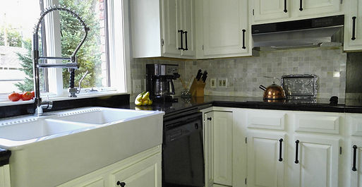 This really was just a quick cost-effective kitchen makeover. The project included painted cabinets, new handles, granite countertop, Carrera marble backsplash, an IKEA farmhouse sink and faucet. Total cost around $2500.